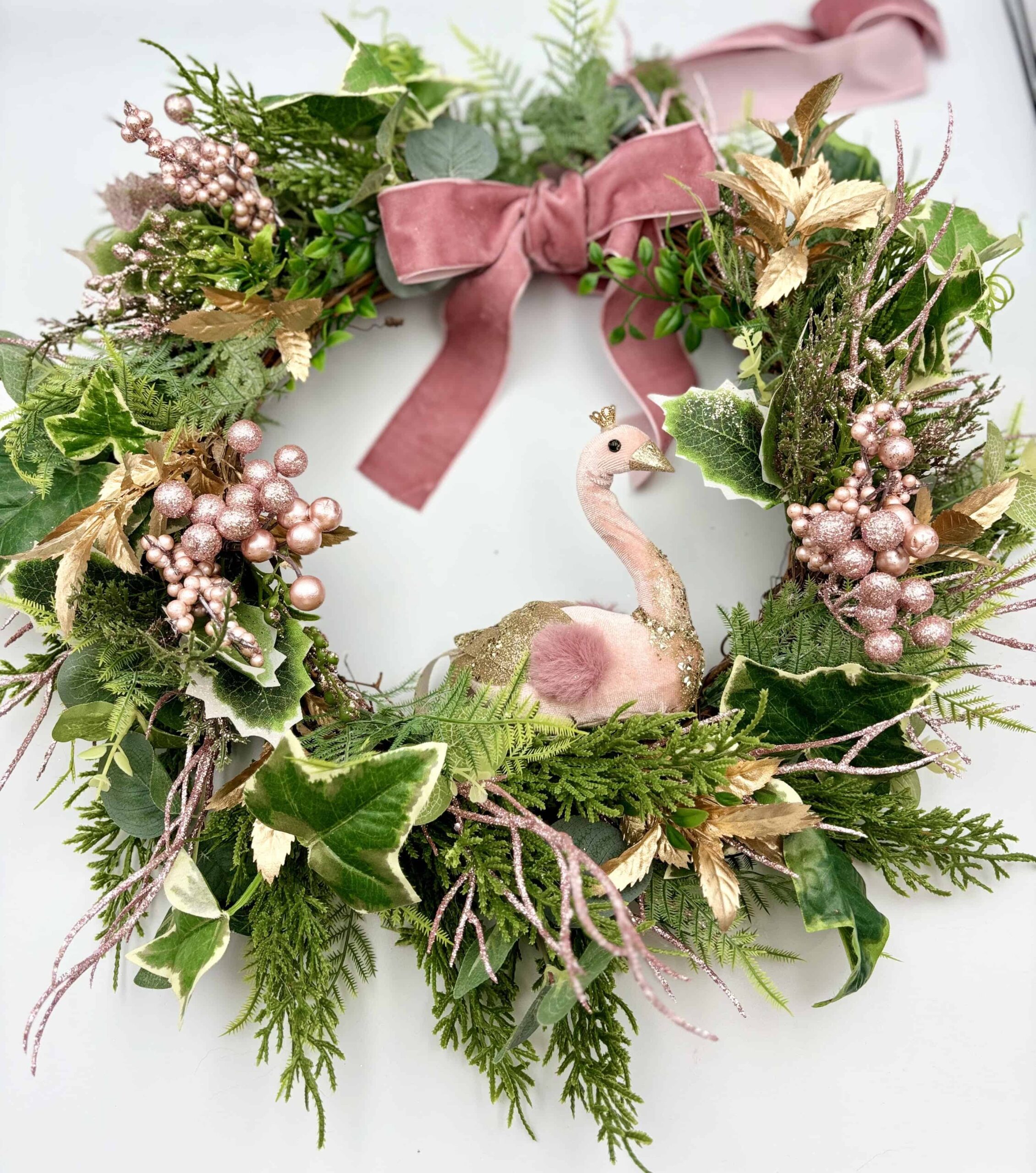Features the most beautiful dusty pink velvet ribbon, rich gold details, along with lush ivy, and glittery festive foliage.