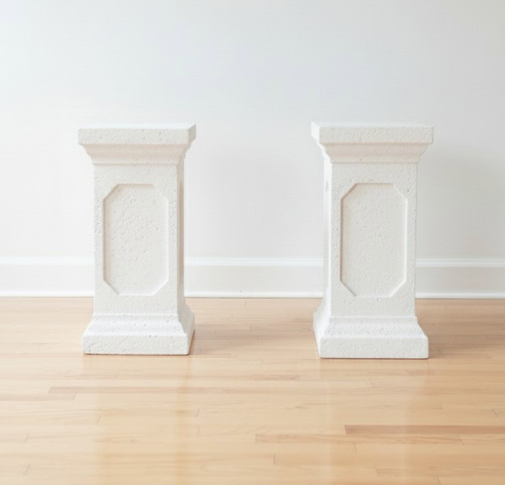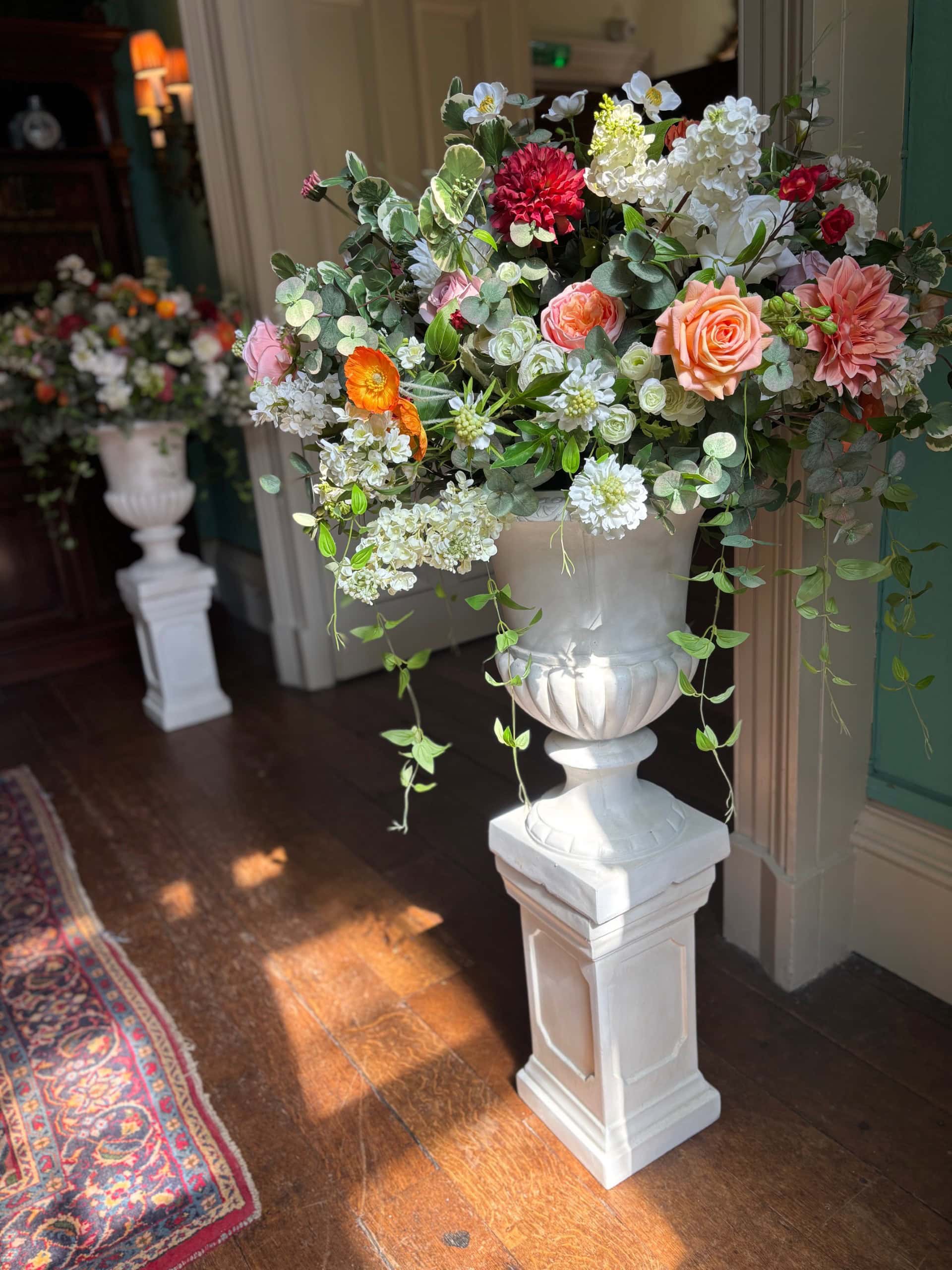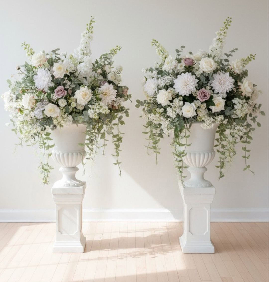 Elevate your wedding décor with our Helena Cream Pedestals, designed to complement our Helena urns for a refined and cohesive look. These timeless pedestals stand at 48cm and are available to rent, offering the perfect way to showcase stunning floral arrangements at your ceremony or reception.